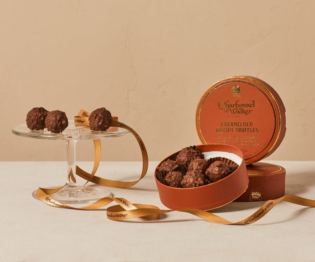 A recent addition to the Charbonnel et Walker luxurious truffle collections, this ever so moreish Caramelised Biscuit Truffle has become so popular, delight with a double layer gift box. Heavenly Milk Chocolate truffles with a caramelised biscuit centre, cinnamon, nutmeg and cloves are all expertly combined to form a deep caramel flavour. If you can imagine the aroma of freshly baked biscuits made into a truffle, then covered in fine milk chocolate with caramelised biscuit pieces, et voila! Scrumptiously mouth-watering!