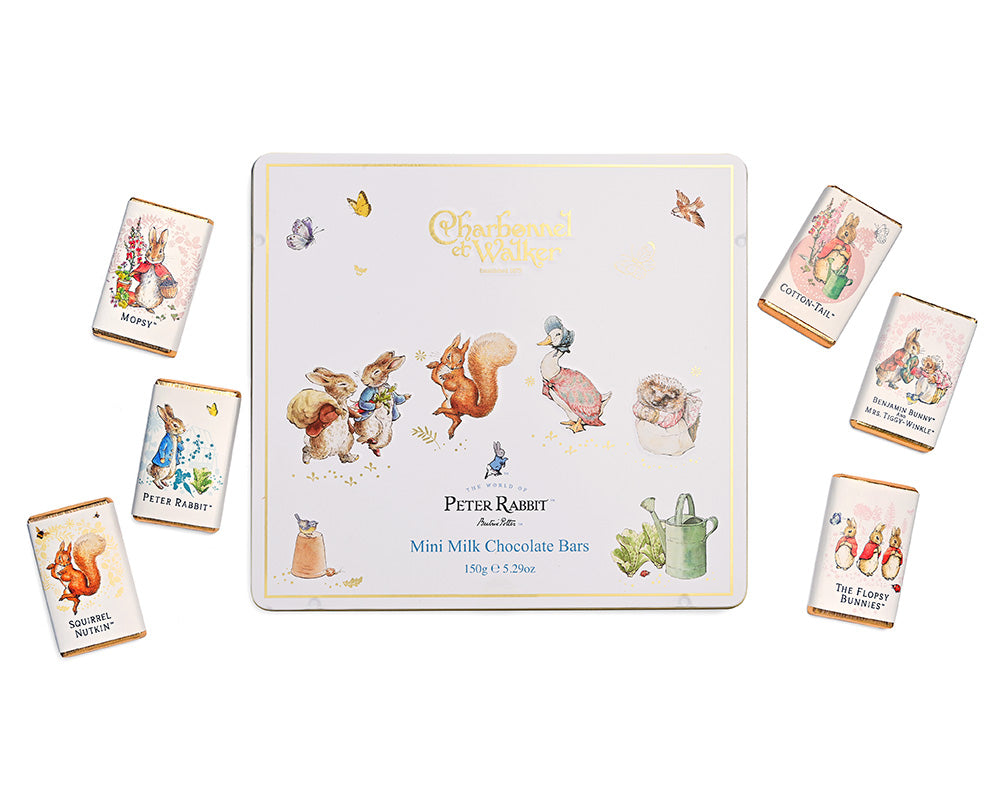 This beautiful Peter Rabbit tin is adorned with illustrations or Peter Rabbit and friends, inside discover 15 mini Milk Chocolate bars, each one decorated with classic Peter Rabbit illustrations from Beatrix Potters famous tales. The perfect gift for celebrations, Birthday’s, special occasions and more.