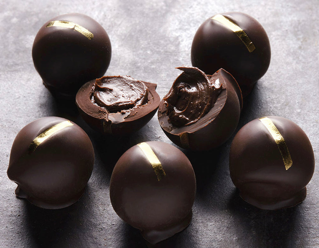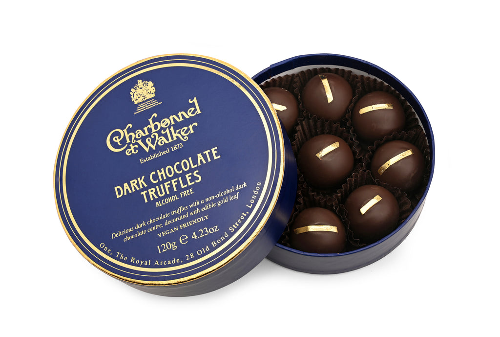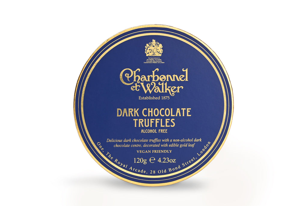 This beautiful midnight blue gift box is filled with delicious, rich,  Dark Chocolate Truffles, filled with a decadent Dark Chocolate centre and decorated with a striking flourish of edible gold leaf. These truffles do not contain alcohol and are Vegan Friendly.