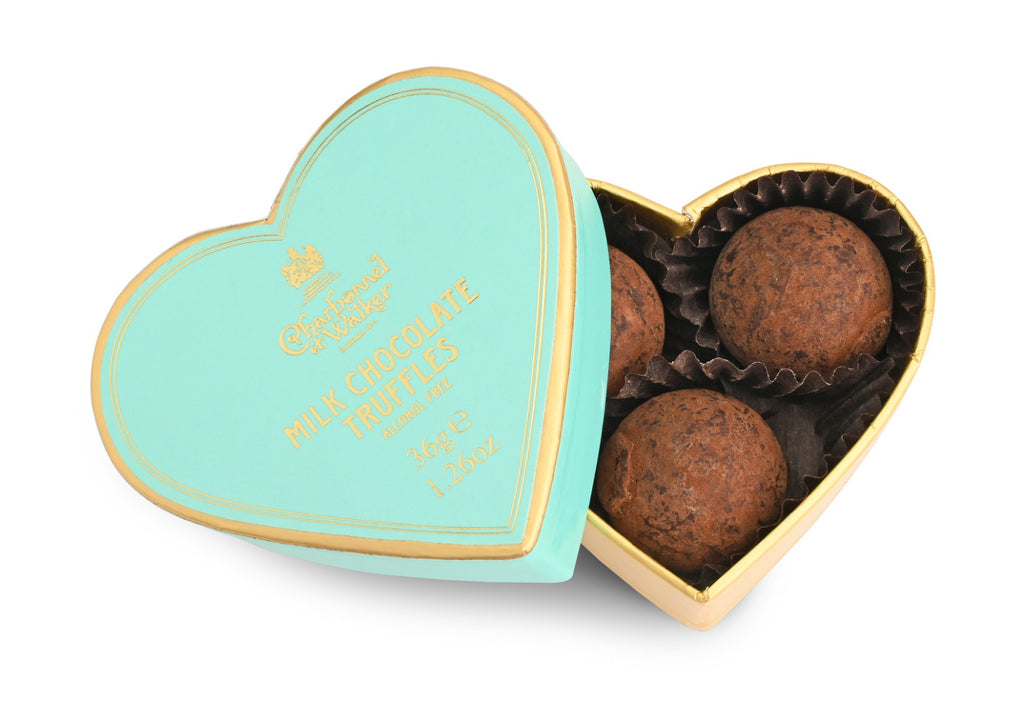 This striking Mini Heart contains three of our delicious Milk Chocolate truffles. Made with a creamy Madagascan Vanilla centre, a generous coating of Milk Chocolate and lightly dusted with a little cocoa powder. All presented in this beautiful deep green, heart shaped gift box.